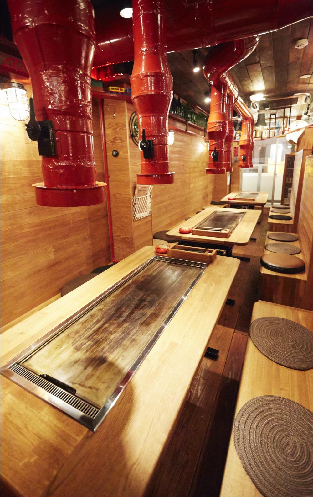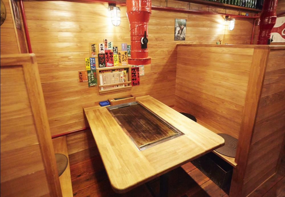 2階:4人掛け鉄板焼き個室風テーブル4席、6人掛け鉄板焼き個室風テーブル3席(20人使用可能)